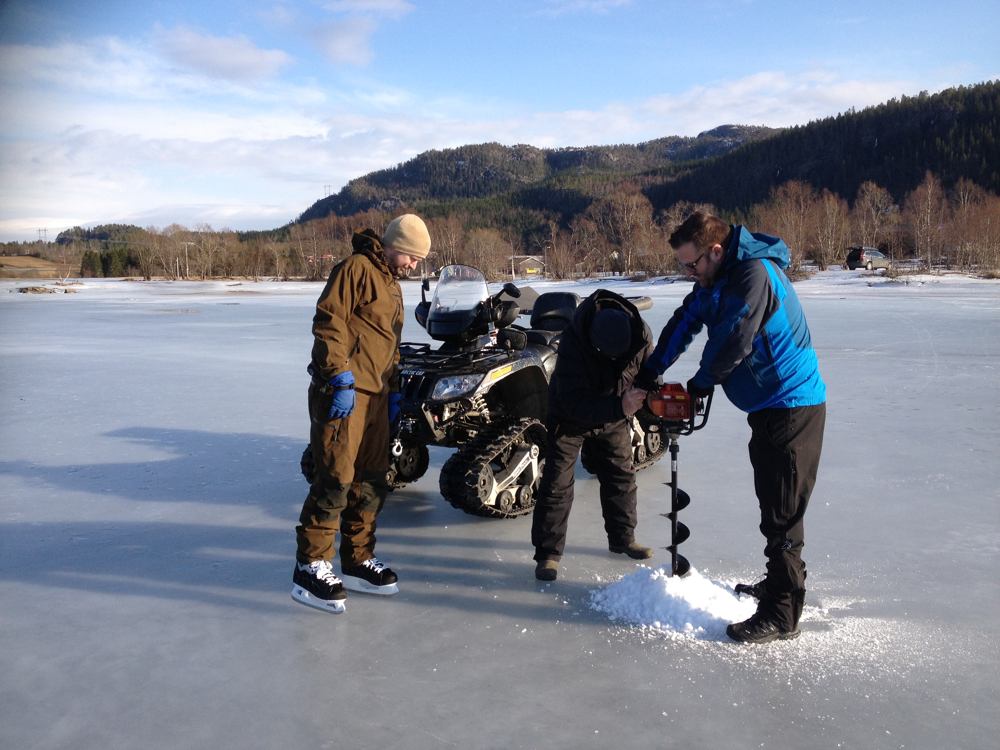 Pappa og Geir borer hull i isen på Eidsvatnet, isen var minst 30 cm tykk så ingen fare for å dette igjennom isen her nei! «Lillebror» Jan Rune passer på at alt går riktig for seg.