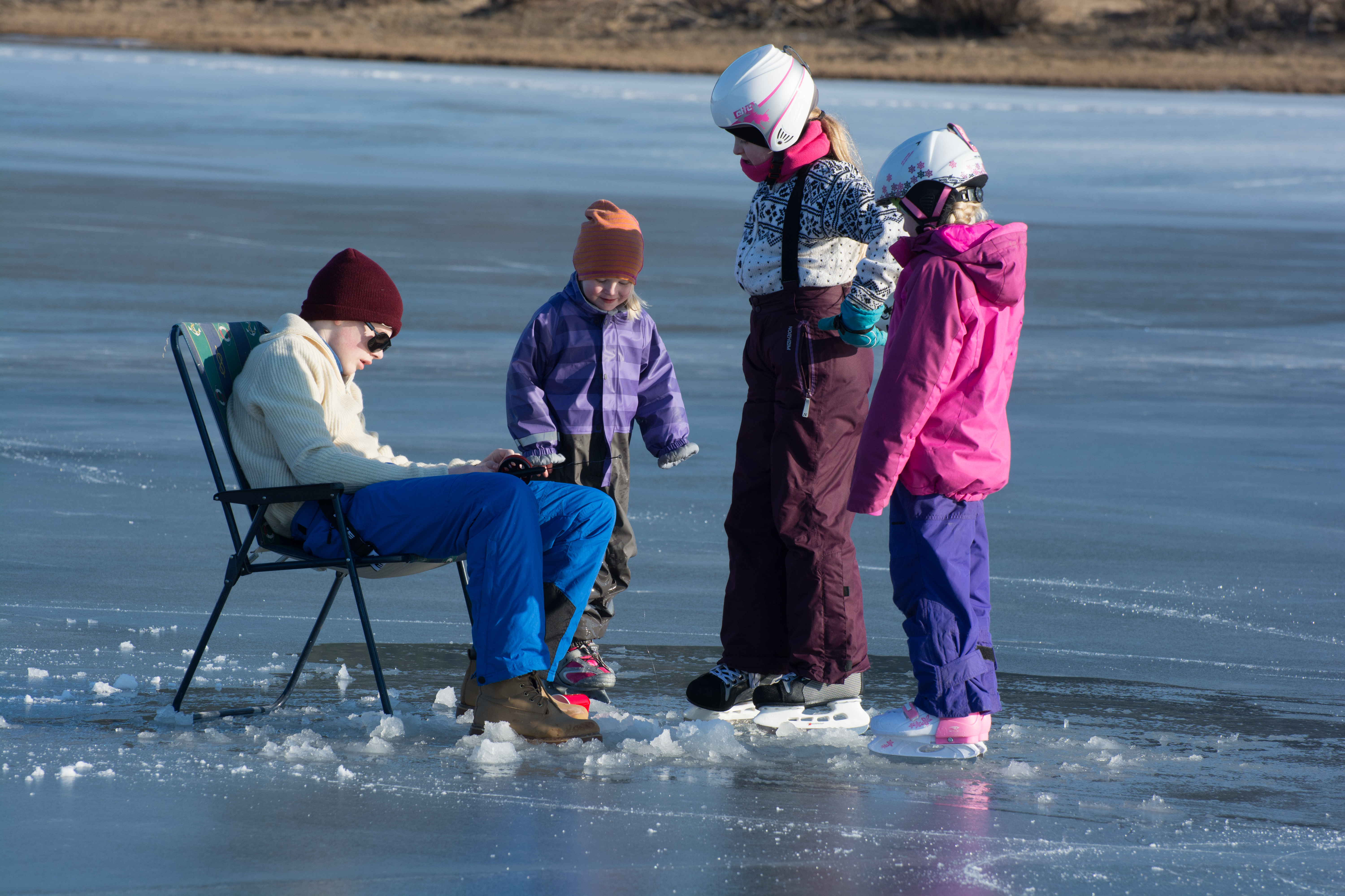 Markus prøver fiskelykken på isen mens lillesøster Celine og søskenbarna Siren og Synnøve følger spent med.